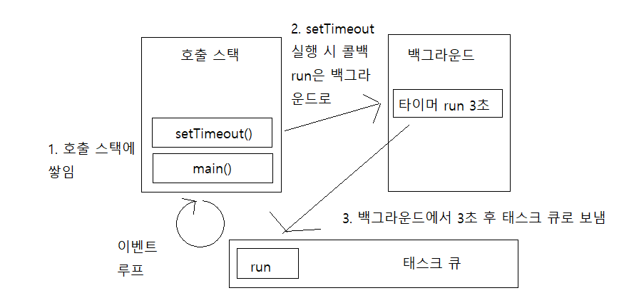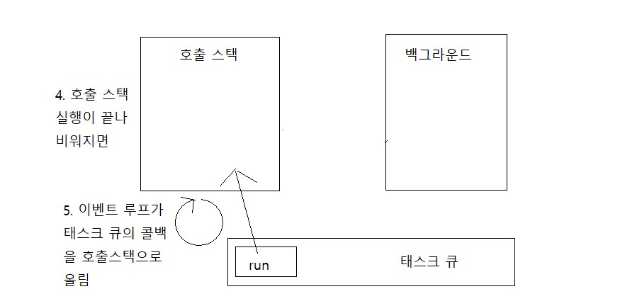 3. setTimeout(run, 0); 이 콜스택으로 호출되어서 실행할 때, WebAPIs(백그라운드)로 이동합니다.