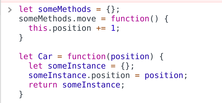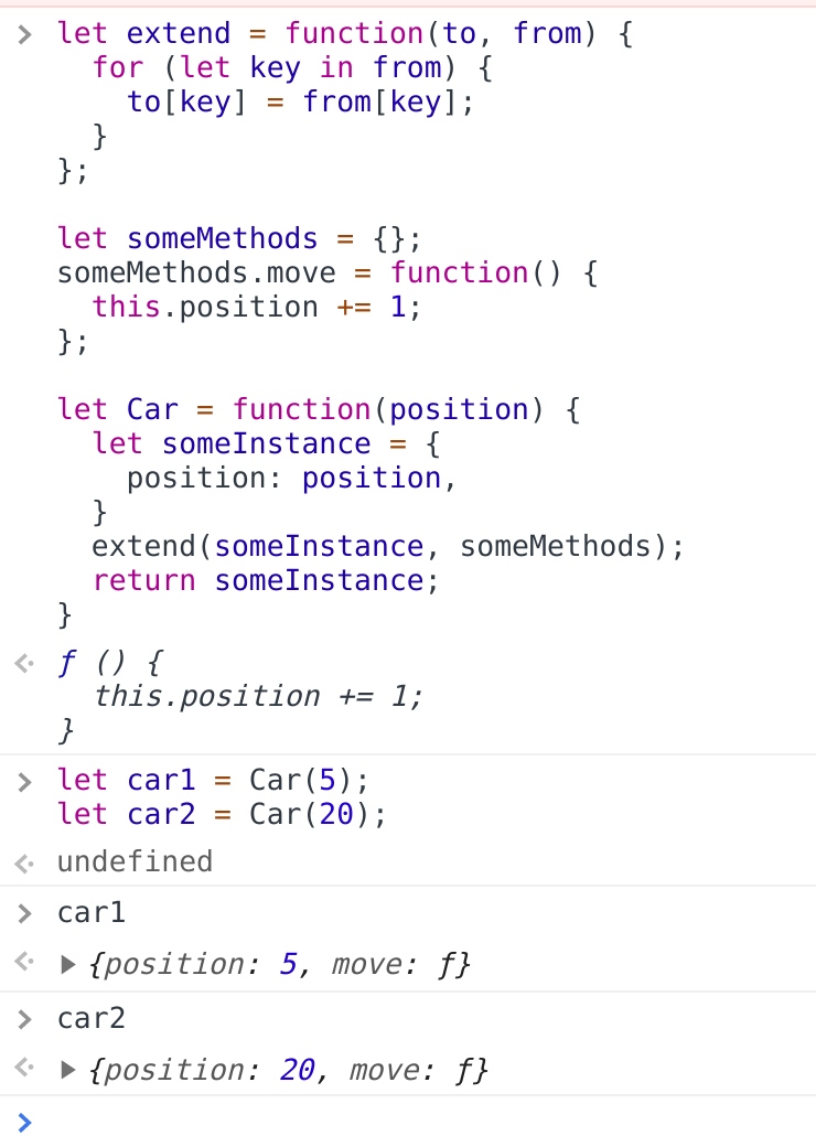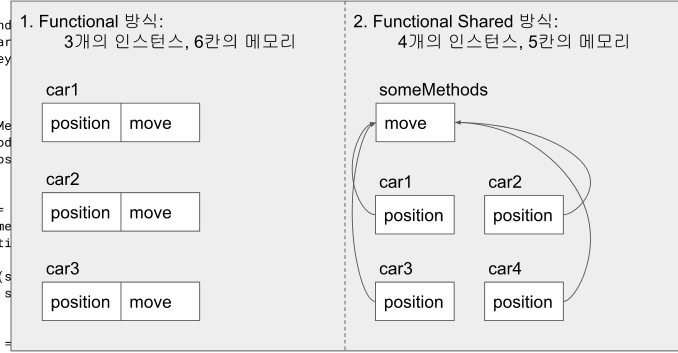 1번은 인스턴스를 생성해줄 때마다 클래스 안에 메서드를 함께 같이 넣어주어야 되는 방면, 2번은 인스턴스를 생성해줄 때 메소드를 같이 넣어주는 대신에, 메소드를 참조하는 방식으로 인스턴스를 생성하게 된다. 이로써, 1번에 비해 2번 방식은 메모리 사용 효율이 증가하게 된다. 상상해보자, 프로젝트 규모가 크게 되면, 인스턴스 개수도 많아진다.