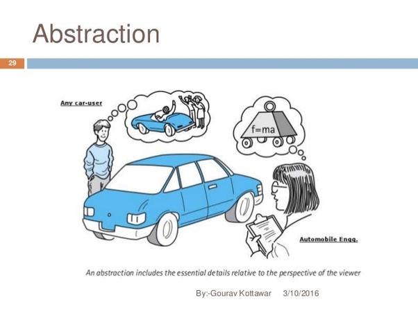 : 데이터 추상화는 사용자에게 필요한 사항만을 보여주는 속성을 말한다. 사소하거나 중요하지 않은 속성들은 사용자에 보이지 않는다. 예를 들어, 만약 한 사람이 차를 운전한다고 가정해보자. 그 사람은 차를 운전할 때, 가속 페달을 밟는 것을 단순히 속도를 올리는 것이라고 생각하지 페달을 밟음으로써 발생하는 내부 메커니즘을 이해하지는 못한다.