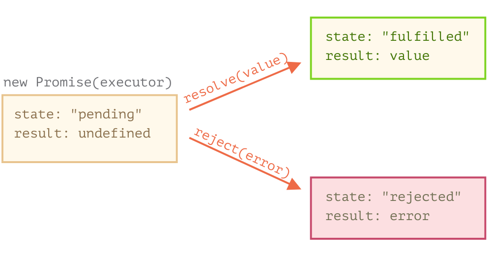 new Promise 생성자가 반환하는 promise 객체가 있는데, state, result라는 내부 프로퍼티를 갖는다.